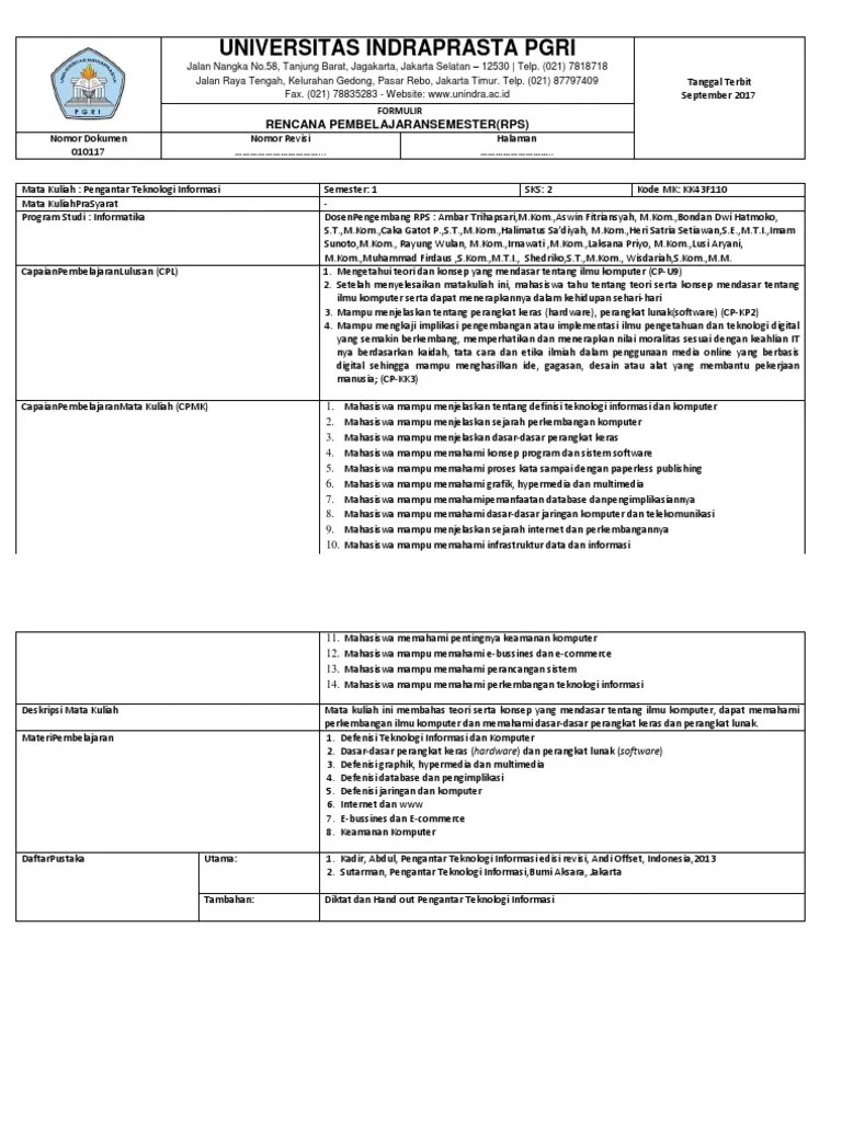 Silabus Pengantar Teknologi Informasi - 1 - Sij001 2 beban studi :. Silabuspengantarteknologiinformasi 1 kode mata ajaran : Sij001 2 beban studi : Pengantar teknologi informasi dan ilmu komputer. View silabus pengantar teknologi dan informasi.doc from information technology 253 at smk negeri 1 purbalingga. Silabus nomor dan nama mata kuliah: